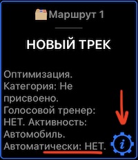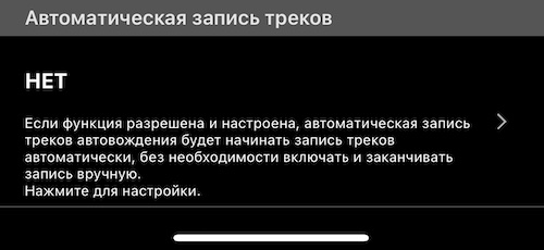 По умолчанию Автоматическая запись треков отключена. Нажмите кнопку настроек в кнопке «НОВЫЙ ТРЕК», чтобы открыть экран настроек записи GPS треков. Перейдите к разделу «Автоматическая запись»: