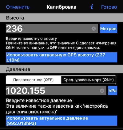 Опции калибровки включают установку высоты и соответствующего давления на поверхности (QFE) или по давлению пересчитанному по среднему давлению на уровне моря (QNH).