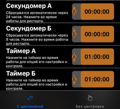 Опции включают или наборы кнопок или инструменты для измерений как секундомеры или таймеры обратного отсчёта.