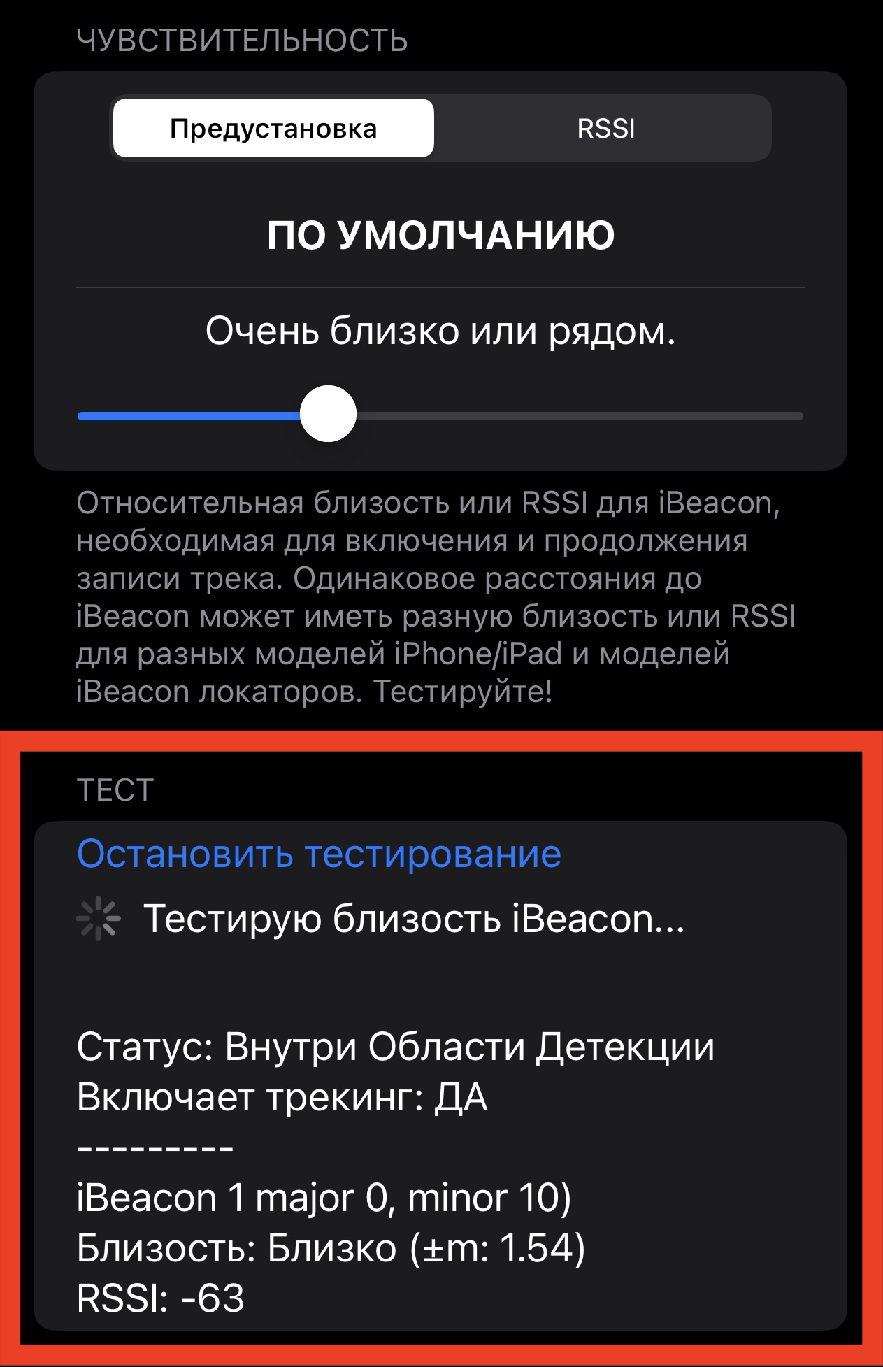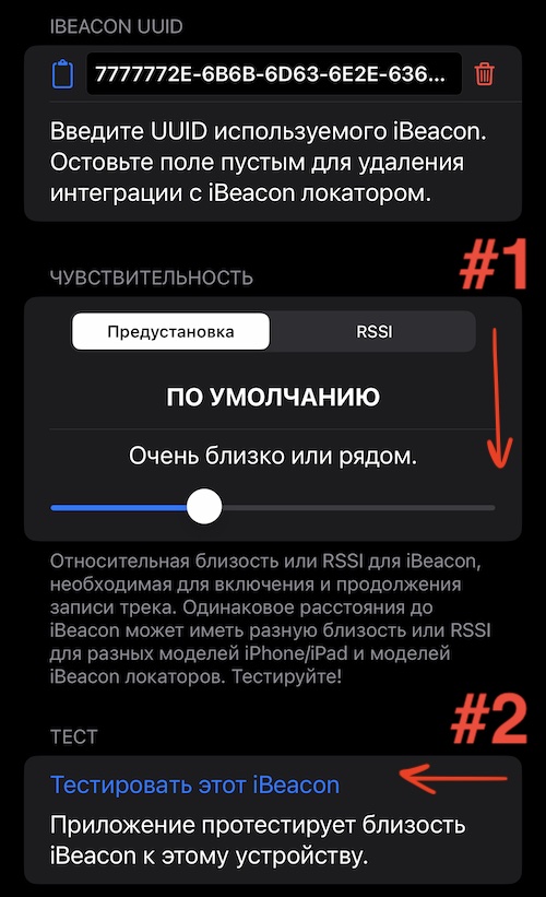 Если у вас очень слабый iBeacon (или спрятан где-то в багажном отсеке) или очень слабый Bluetooth в iPhone (или сотовом iPad), переместите ползунок чувствительности в самое высокое положение (крайнее правое). В этом положении запись будет запущена, если iPhone вообще сможет обнаружить iBeacon с этим UUID. Расстояние к маякам не проверяется.