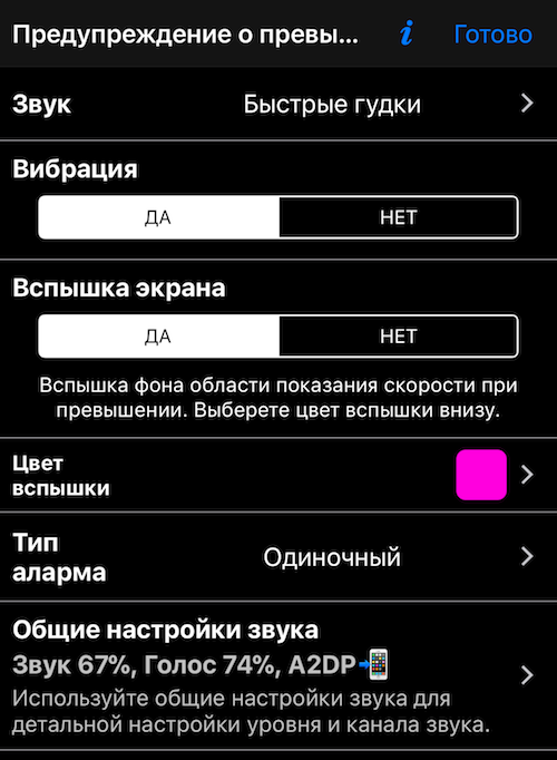 Опции предупреждения о превышении скорости (PRO)