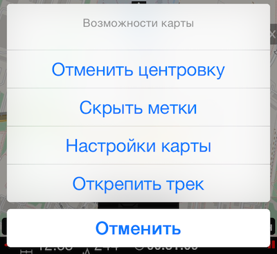 Здесь Вы можете открепить трек от карты, скрыть или показать метки на карте, отменить или включить центровку карты по Вашему местоположению и открыть настройки карты.