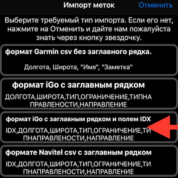 Как для камер с mapcam, так и для speedcamonline.ru, пожалуйста выберете 3 рядок сверху, т.е. “формат iGO с заглавным рядком и полем IDX”. Именно такой iGO формат используют оба сервера.