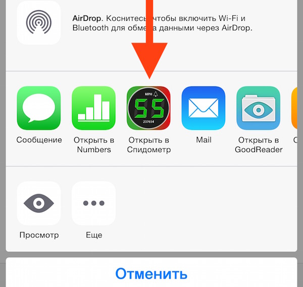 При получении, в приложении email подержите палец на приложенном к емайлу файле (в других email приложениях может быть и специальная кнопка “Открыть”) пока Вы не увидите возможности. Выберите спидометр: