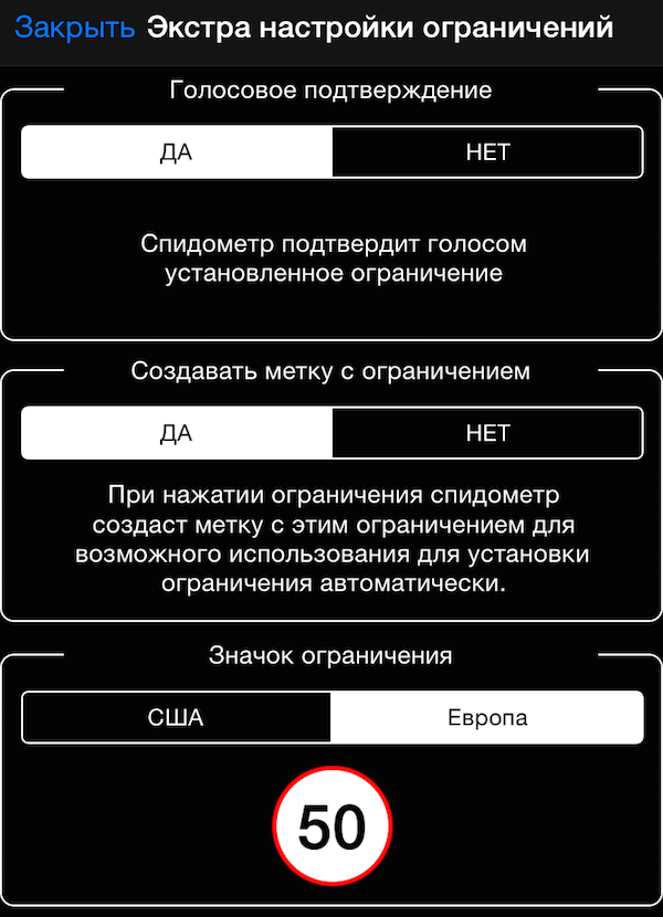 “Голосовое подтверждение” (ДА) позволит спидометру подтвердить Вам ограничение голосом в момент когда Вы его ставите через кнопку.