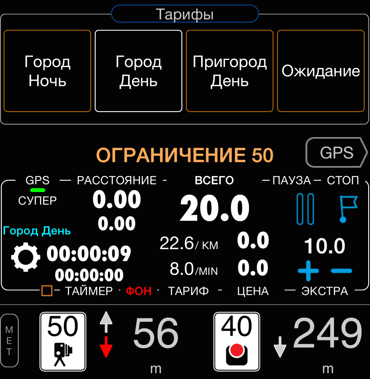 Выберите “Тарифы таксометра”. Теперь спидометр даст Вам возможность переключать тарифы в одно нажатие. В эту панель можно выбрать только уже существующие тарифы, добавление новых как всегда происходит через кнопку настроек тарифов.