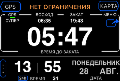 Сделано для использования на моторных лодках и скутерах, когда сигнал превышения не слышен. Поэтому приложение начинает “вспыхивать” экраном под цифрами, что достаточно хорошо привлекает боковое зрение. Также в этом режиме показывается время до заката, так как на многих водохранилищах занятия спортом с помощью моторных катеров запрещены.