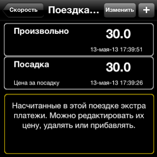 Таксометр добавляет цену за посадку в дополнительные услуги (в нашем случае 30 рублей) и начисляет минималку в цену (100 рублей для использованного тарифа).