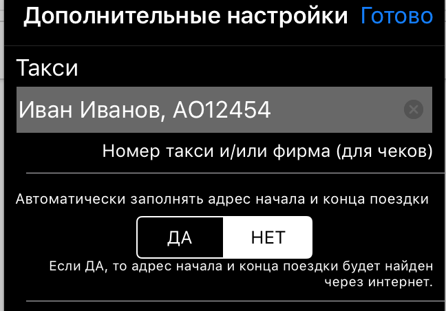 “Такси” откроет страницу настроек имени такси и автоматического определения адреса начала и конца поездки: