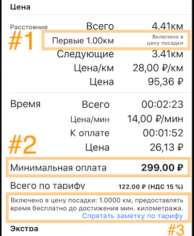 #3 - Заметки по тарифу, как предоставленный километраж или время ожидания, вынесены на отдельный рядок. Его можно спрятать нажав на кнопку “Спрятать заметку по тарифу”.