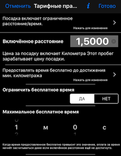Добавлен новый экран. Здесь можно наставить если в мин оплате или в цене посадки предоставляется какое то расстояние. Плюс наставить правила оплаты за время пока это расстояние не достигнуто.